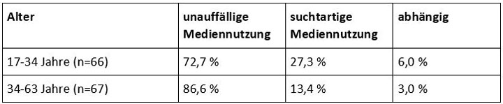 Sechs Personen oder 4,4 % weisen einen Punktewert höher als 13 Punkte auf und fallen damit in den Bereich der Abhängigkeit. Im Vergleich mit der Studie aus dem Jahr 2012 lässt sich ein hoher Anteil an Menschen feststellen, die die Kriterien für medienbasiertes Suchtverhalten erkennen lassen.