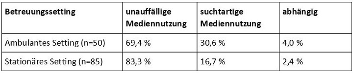 Auffällig ist in Tabelle 8 die hohe Zahl der von suchtartiger Mediennutzung Betroffenen im ambulanten Setting. Dies könnte darauf hindeuten, dass die Strukturen in stationären Einrichtungen mehr Kontrolle über den Medienkonsum bieten, während eine Person, die Beratung in einem ambulanten Setting wahrnimmt, außerhalb dieser Termine weitestgehend selbst über ihren Medienkonsum und ihre Tagesstruktur bestimmen kann.