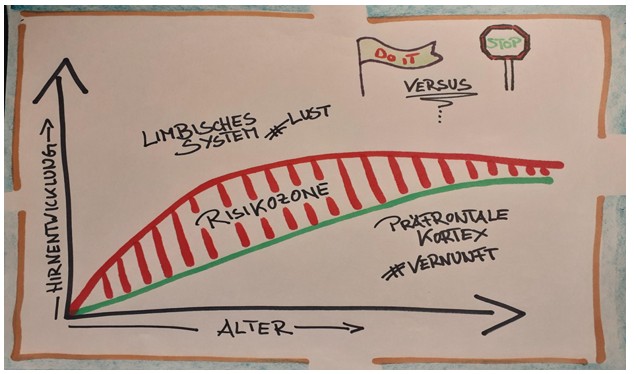 Ohne rauschhafte Erlebnisse wäre das Leben weniger lebenswert. Diese können durch starke Emotionen, bestimmte Tätigkeiten oder auch psychoaktive Substanzen hervorgerufen werden. Ohne die Bereitschaft zu gewissen Risiken ist kein Leben und erst recht keine Entwicklung möglich, weder individuell noch gesellschaftlich. Dieser Prozess manifestiert sich insbesondere in der Adoleszenz. In dieser besonderen Lebensphase kommt es auch vermehrt zur Verwendung von Substanzen als Rauschmittel. Es ist die Zeit rasanter Entwicklung, in der neurologisch, körperlich, sozial und psychisch kaum ein Stein auf dem anderen bleibt. Sowohl Körper als auch Geist verändern sich. So wird das Verlangen nach Intensität (Lust) verstärkt, während die Fähigkeit zur Steuerung des eigenen Verhaltens sich erst allmählich entfaltet (Vernunft) (vgl. Abb. 1: „Das Wunder der Pubertät“).
