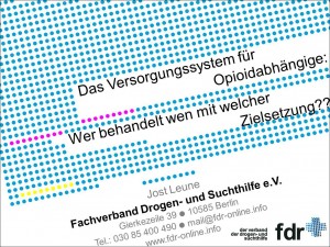 Leune schließt seinen Vortrag mit dem Hinweis, dass das Versorgungssystem für Opioidabhängige noch besser werden würde, wenn das gegliederte System der sozialen Sicherung durchlässiger wäre, wenn Einrichtungsgrenzen überwunden werden und eine gemeinsame (Fach-)Sprache gefunden werden könnte und das System auskömmlich finanziert wäre.