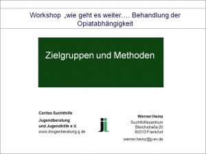 Im Vortrag von Werner Heinz, Leiter der AG Substitution der Caritas Suchthilfe (CaSu), ging es um die Frage „Mit welchen Zielgruppen und Methoden ist Suchtbehandlung bei Opiatabhängigen möglich?“. Als Ausgangslage stellte er fest, dass Substitution in der heutigen Behandlung von Opiatabhängigkeit der Normalfall sei und dass die Behandlung nur auf der Grundlage der Substitutionstherapie weiterentwickelt werden könne. Zwei Hürden müssten überwunden werden, die er in seiner Präsentation so formuliert: „Substitution verhindert medizinische Rehabilitation – Medizinische Rehabilitation sperrt Substituierte aus“. Wenn hier ein Brückenschlag gelingt, dann können die Defizite der aktuellen Substitutionspraxis aufgefangen und mehr Drogenabhängige zur Chance (nicht dem Zwang) der Abstinenzorientierung hingeführt werden. Als Defizit der Substitution nannte Heinz, dass keine Suchttherapie stattfinde. Die psychosoziale Betreuung, die außerdem nur wenig Substituierte erreiche, sei Suchtsozialarbeit und motivationale Suchtberatung, mit der jedoch das hohe Ausmaß an psychischen Störungen und psychosozialen Entwicklungsdefiziten nicht bewältigt werden könne – eine Feststellung, die die Ergebnisse der PREMOS-Studie bestätigen.