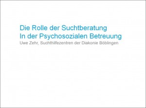 Im Anschluss an die Übersichtsreferate folgten mehrere Vorträge, die sich mit den Behandlungsmodulen und ihren Entwicklungsmöglichkeiten beschäftigten. Zu Beginn dieses neuen Themenblocks stellte Uwe Zehr vom Verein für Jugendhilfe e. V. in Sindelfingen „Die Rolle der Suchtberatung und der psychosozialen Betreuung“ vor. Als Erstes steckte er die Rahmenbedingungen ab: Suchtberatung wird von den Kommunen finanziert. Daraus ergibt sich, dass die Kommunen auch überwiegend die Aufgaben der psychosozialen Betreuung (PSB), die durch die Suchtberatungen wahrgenommen werden, definieren. Laut BtMVV § 5, Abs. 2, Nr. 2 muss jeder substituierte Patient eine PSB erhalten, oder anders herum: Jeder substituierende Arzt hat einen rechtlichen Anspruch auf PSB für seine Klienten, den die Kommune in dieser Region erfüllen muss. Selten wird PBS im Rahmen individueller Eingliederungshilfe geleistet, selten ist sie ein verbindlicher Teil des medizinischen Versorgungssystems.