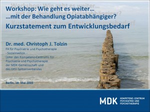 Dr. Christoph Jonas Tolzin äußerte sich aus Sicht der Gesetzlichen Krankenversicherung. Er verwies auf die für die GKV verbindlichen rechtlichen Grundlagen der Behandlung Opiatabhängiger. Dazu zählen das Betäubungsmittelgesetzt, die Betäubungsmittelverschreibungsverordnung (BtMVV), die Richtlinien zur substitutionsgestützten Behandlung Opiatabhängiger und das SGB V. Aus den Richtlinien zur substitutionsgestützten Behandlung Opiatabhängiger zitierte er wesentliche Bestimmungen und die letzten Änderungen der Richtlinie Methadon aus dem Jahr 2013. Hier wurden die räumlichen und personellen Anforderungen an diamorphinsubstituierende Einrichtungen den realistischen Möglichkeiten angepasst. Eine Evaluation der Substitution mit Diamorphin sei abzuwarten.