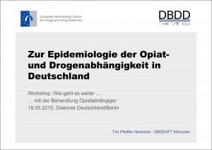 Auf die Grußworte folgte der erste Themenblock mit einführenden Übersichtsreferaten. Dr. Tim Pfeiffer-Gerschel, Geschäftsführer der Deutschen Beobachtungsstelle für Drogen und Drogensucht (DBDD), präsentierte aktuelle Zahlen zum Thema „Epidemiologie der Opiat- und Drogenabhängigkeit in Deutschland“. Die Prävalenz riskanten Opioidkonsums ist schwer zu schätzen. Laut DBDD-Jahresbericht 2014 führen Berechnungen auf der Basis von Zahlen aus Behandlung, Polizeikontakten und Drogentoten zu einer Schätzung der Zahl riskanter Konsumenten von Heroin in Deutschland auf 57.000 bis 182.000. Dies entspricht einer Rate von 1,05 bis 3,4 Personen pro 1.000 Einwohner im Alter von 15 bis 64 Jahren. Legt man der Schätzung nur Behandlungsdaten zugrunde, ist die Prävalenz seit 2005 ansteigend, nach Polizeikontakten und Todesfällen geschätzt ist die Prävalenz sinkend. Die europäischen Daten zeigen Anzeichen eines rückläufigen Heroingebrauchs: weniger neue Klienten, eine alternde Kohorte und ein Rückgang des iv-Konsums.