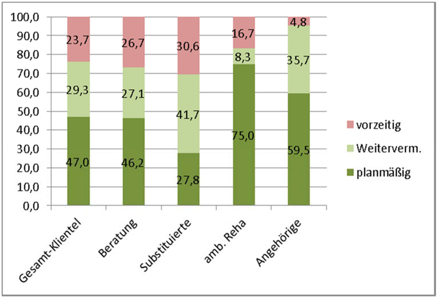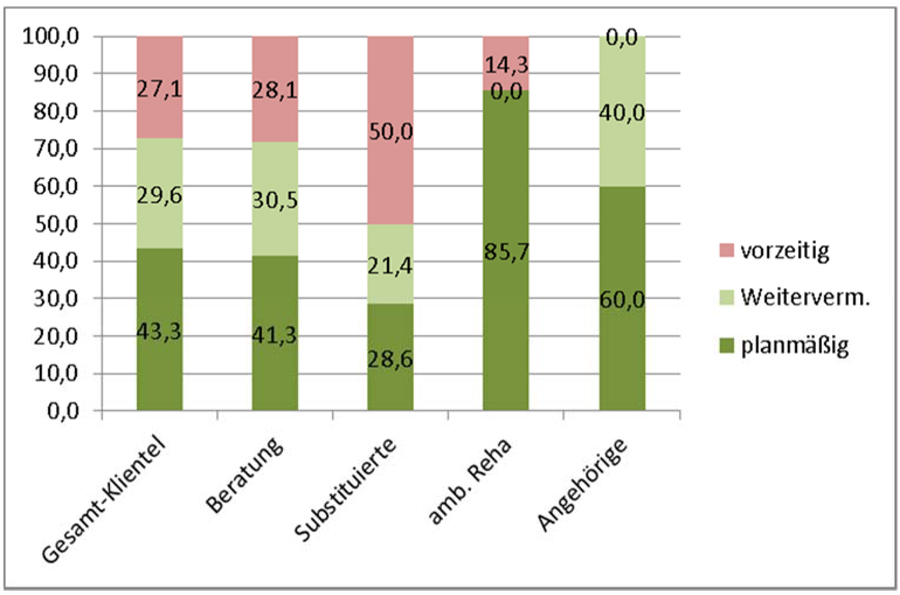 Abb. 1b) Beispiel Beratungsstelle: Beendigungen/Erfolge 2017, Klient*innen ohne Migrationshintergrund. Quelle: Condrobs 2017