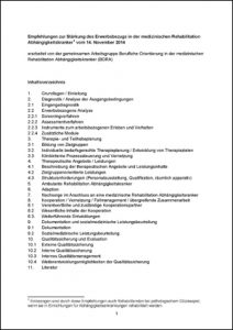 - Beckmann, Ulrike/Eckstein, Gerhard/Hennig, Uwe/Hoffmann, Sabine/Koch, Andreas/Köhler, Joachim u. a. (2014): Empfehlungen zur Stärkung des Erwerbsbezugs in der medizinischen Rehabilitation Abhängigkeitskranker vom 14. November 2014. Deutsche Rentenversicherung Bund. Berlin.