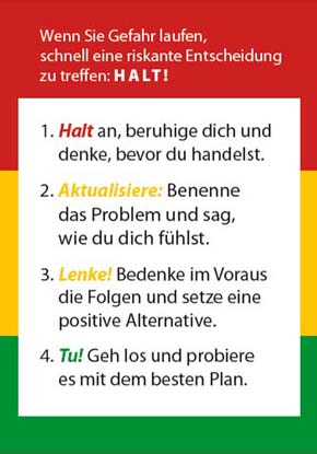 - Auseinandersetzung mit impulsivem Verhalten und dem Treffen von Entscheidungen (z. B. mit Hilfe der Signalkarte HALT!, s. Abb. 3).