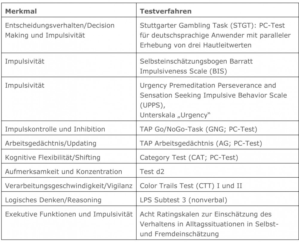 Zur Diagnostik des Entscheidungsverhaltens wurde die Stuttgarter Gambling Task (STGT), eine deutsche Version der Iowa gambling task (IGT) von Damasio und Bechara, programmiert und in eine Testbatterie aus bewährten Verfahren zum Testen exekutiver Funktionen integriert. Weiterhin wurde ein Messinstrument für Alltagsverhalten in Form von Ratingskalen zur Selbst- und Fremdeinschätzung entwickelt. Die diagnostischen Verfahren wurden in einer Vorstudie mit 30 abhängigen Probanden geprüft und selektiert. Eingesetzt wurden am Ende die Verfahren, die in der Tabelle (Abb. 5) aufgelistet sind.