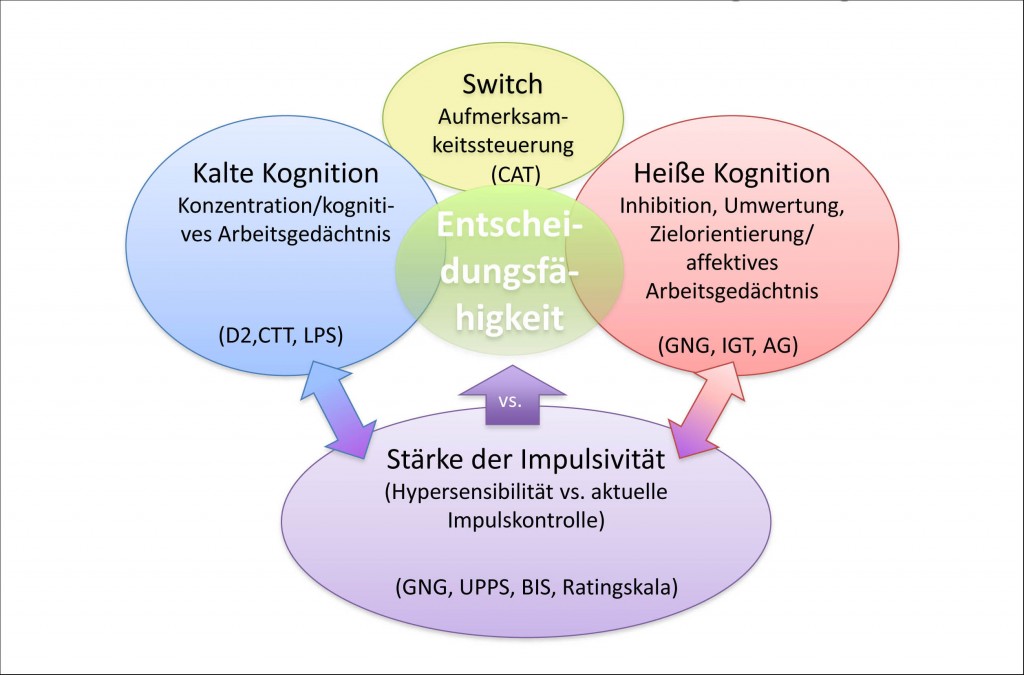 Abb. 2: Faktorenmodell der Entscheidungsfähigkeit: Kalte und heiße Kognition bilden als Top-Down-Kontrollsysteme ein Gegengewicht zur Impulsivität. Von der „Kräfteverteilung“ zwischen Kontrolle und Impulsivität hängen die Entscheidungsfähigkeit und die Fähigkeit zur Aufmerksamkeitssteuerung ab.