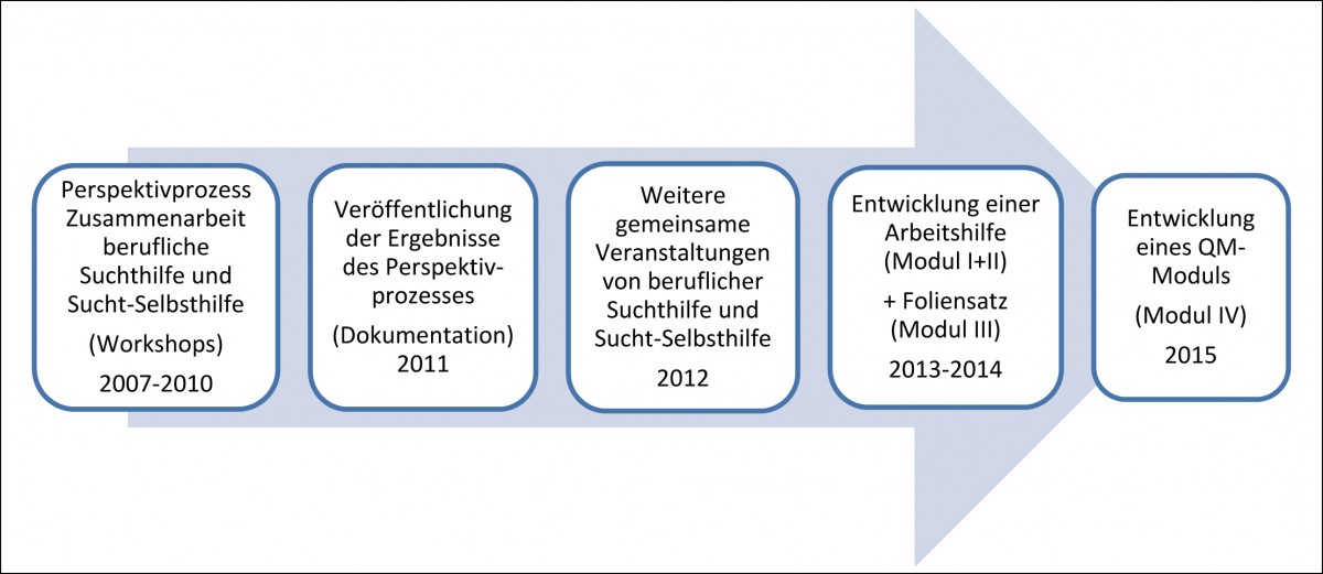 Im Folgenden werden die zentralen Grundsätze und Erfolge des bisherigen Prozesses zur Zusammenarbeit von beruflicher Suchthilfe und Sucht-Selbsthilfe in der Caritas dargestellt sowie ein Ausblick auf seine Weiterführung gegeben (vgl. Abb. 2).