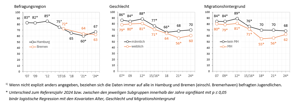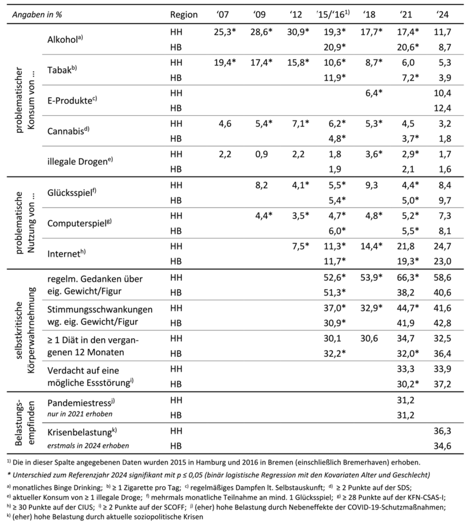 In Bezug auf die Verbreitung des riskanten Gebrauchs von Alkohol, Tabak, Cannabis und anderen psychoaktiven Substanzen zeigt sich sowohl für die Hamburger als auch für die Bremer Jugendlichen ein kontinuierlicher Rückgang der Prävalenzraten. Diese Entwicklungen stellen keine auf die beiden Stadtstaaten beschränkte Besonderheit dar. Auch die aktuellen Studien für andere Beobachtungsgebiete in Deutschland deuten auf ähnliche Trends hin (vgl. ESPAD Group 2025; Martens et al. 2025; Orth & Nitzsche 2025; Orth et al. 2025; Werse et al. 2023).