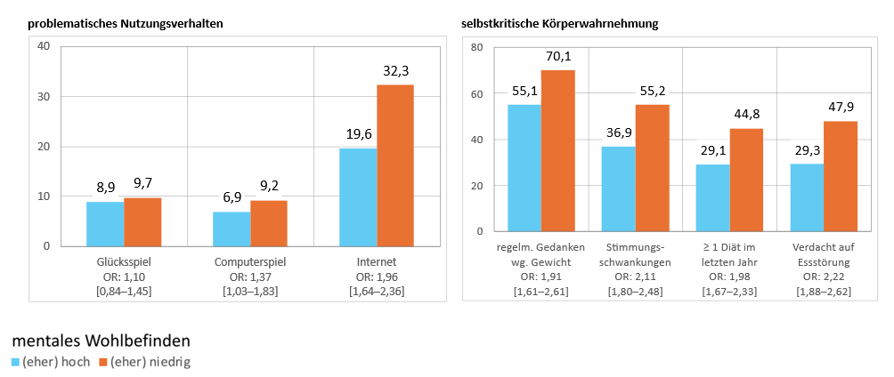 Für diese Jugendlichen besteht auch gemäß der SCOFF-Skala ein mehr als doppelt so hohes Risiko einer möglichen Essstörung (OR = 2,22; 95 %-KI: 1,88–2,62). Ähnlich wie bei den Risikowahrscheinlichkeiten in Bezug auf den problematischen Umgang mit den verschiedenen Suchtmitteln erweist sich das (eher) hohe mentale Wohlbefinden auch im Kontext der selbstkritischen Körperwahrnehmung als ein hochwirksamer Schutzfaktor.