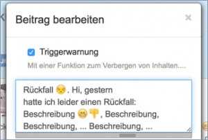 Ziel des Modellprojektes und der formativen Begleitforschung ist es, ein passgenaues onlinebasiertes Selbsthilfeangebot zu erstellen. Basierend auf aktuellen internationalen Erkenntnissen und empirischen Befunden aus Deutschland wurden eine Reihe von zielgruppenspezifischen Anforderungen definiert und entsprechende Strategien und Funktionen entwickelt. Während der Evaluationsphase werden diese Funktionen auf ihre Eignung und Akzeptanz bei unterschiedlichen Zielgruppen getestet sowie ggf. weiterentwickelt. So wurde eine spezielle Funktion umgesetzt, um so genannten Trigger-Effekten durch unkontrollierte Konfrontation mit bestimmten Nutzerbeiträgen entgegenzuwirken. Dies soll insbesondere dem Schutz von Menschen mit Traumatisierungen dienen (beispielsweise bei Schilderungen von Gewalterfahrungen), aber auch dem möglichen Auftreten von Suchtdruck entgegenwirken.