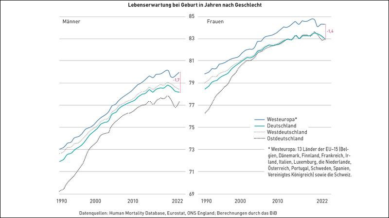 Seit der Jahrtausendwende haben jedoch sowohl West- als auch Ostdeutschland gegenüber den anderen Ländern Westeuropas an Boden verloren. Betrug der Rückstand von Deutschland bei der Lebenserwartung der Männer im Jahr 2000 rund 0,7 Jahre, ist dieser bis 2022 auf 1,8 Jahre angestiegen. Ein ähnliches Bild zeigt sich auch bei den Frauen: Hier vergrößerte sich der Abstand bei der Lebenserwartung von 0,7 Jahren (2000) auf aktuell 1,4 Jahre. Lediglich im ersten Pandemiejahr 2020 wurde bei beiden Geschlechtern eine kurzfristige Annäherung an den westeuropäischen Durchschnitt verzeichnet, da die Corona-sterblichkeit in Deutschland zunächst deutlich geringer ausfiel als in anderen Ländern Westeuropas.