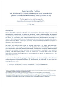Seit 1. Juli 2021 regelt der Glücksspielstaatsvertrag 2021 das deutsche Glücksspielrecht neu. Neben der Zulassung von Online-Glücksspielen wurden auch die Vorgaben für die Werbung für Glücksspiele abgemildert. Werbung für Glücksspiele ist mittlerweile omnipräsent im Alltag sichtbar. Dies führt zu einer Verharmlosung und Normalisierung von Glücksspielen in der Gesellschaft. Im Sinne des Jugend-, Spieler- und Verbraucherschutzes ist dies eine Fehlentwicklung. Aus diesem Grund haben die Länderkoordinator:innen Glücksspielsucht von Berlin, Hamburg, Hessen, Niedersachsen und Thüringen das gemeinsame Positionspapier „Suchtfachliche Position zur Werbung für Online-Glücksspiele und Sportwetten gemäß Glücksspielstaatsvertrag 2021 (GlüStV 2021)“ entwickelt.