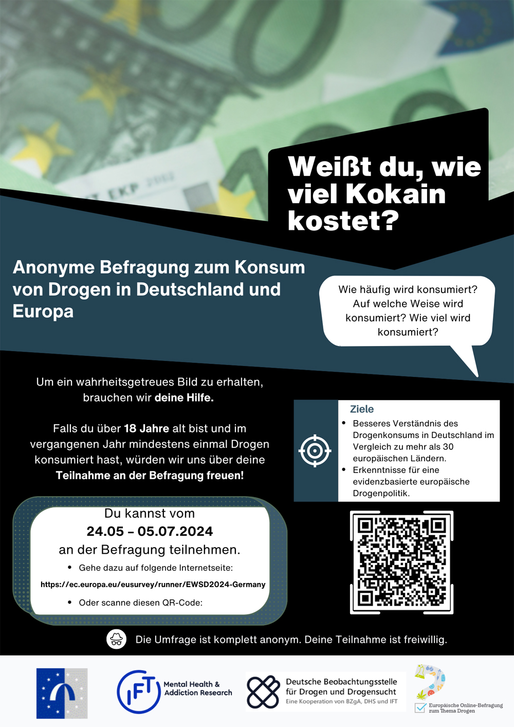 Im Rahmen des Projekts „European Web Survey on Drugs” (EWSD 2024) wird auch in diesem Jahr wieder eine europäische Online-Umfrage zum Thema Drogen durchgeführt. Das Projekt wurde von der Europäischen Beobachtungsstelle für Drogen und Drogensucht (EMCDDA) initiiert, um ein besseres Verständnis des Drogenkonsums in Europa zu erlangen. Der EWSD 2024 wird in ungefähr 30 europäischen Ländern durchgeführt. In Deutschland wird die Umfrage von der Deutschen Beobachtungsstelle für Drogen und Drogensucht (DBDD) und dem Institut für Therapieforschung (IFT) koordiniert.