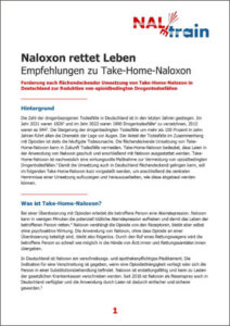 Take-Home Naloxon ist eine wirksame Maßnahme zur Reduktion von Todesfällen, die durch den Konsum von Opioiden verursacht wurden. Das Institut für Suchtforschung an der Frankfurt University of Applied Sciences, die Deutsche Aidshilfe und akzept e. V. fordern die flächendeckende Implementierung von Take-Home Naloxon in Deutschland und geben zentrale Empfehlungen, wie dies gelingen kann. Die Empfehlungen gehen aus einen abgeschlossenen Modellprojekt in Bayern (2018) und dem laufenden Bundesmodellprojekt NALtrain hervor. Sie beziehen sich auf folgende Punkte: