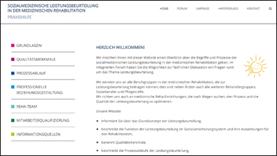 Die Seite www.leistungsbeurteilung-reha.de wendet sich an alle Berufsgruppen in der medizinischen Reha, die zur Leistungsbeurteilung beitragen können, neben der Ärzteschaft auch an in der Sozialberatung tätige Personen und Pflegekräfte. In die Entwicklung der Seite sind umfassende Expertisen, Erkenntnisse und Instrument-Entwicklungen aus den Reha-Einrichtungen eingeflossen. Berücksichtigt wurde dabei ausdrücklich die Nutzerperspektive der Personen und Instanzen, die sich bei der Erstellung von Gutachten und Einschätzungen am Reha-Entlassbericht orientieren, etwa die Dienste der Krankenkassen, der Rentenversicherung, der Agentur für Arbeit sowie Gutachter und Sozialrichter, aber auch Hausärzte, Fach- und Betriebsärzte. Die Website