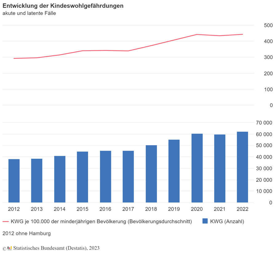 Auch langfristig hat sich die Zahl der Kindeswohlgefährdungen erhöht: In den Jahren von 2012 bis 2022 betrug der Anstieg rund 24.000 Fälle beziehungsweise 63 Prozent. Dabei nahmen die Fallzahlen von 2017 bis einschließlich des ersten Corona-Jahres 2020 besonders kräftig zu – und zwar jährlich um 9 bis 10 Prozent. Im zweiten Corona-Jahr 2021 sanken sie dann leicht (‑1 Prozent), um im Jahr 2022 mit 4 Prozent wieder moderat zu wachsen.