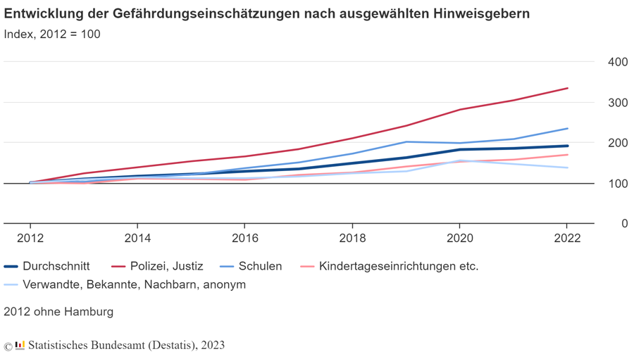 Vergleichsweise stabil geblieben ist dagegen auch in Zeiten der Pandemie offensichtlich das Meldeverhalten von Polizei und Justizbehörden. Diese Hinweisgeber weisen auch im längerfristigen Vergleich eine beachtliche Entwicklung auf: 61.300 Gefährdungseinschätzungen wurden 2022 von Polizei und Justiz angeregt – gut dreimal so viele wie im Jahr 2012 (+234 Prozent). Zum Vergleich: Im Durchschnitt hatte sich die Zahl der Gefährdungseinschätzungen im Zehnjahresvergleich in etwa verdoppelt (+91 Prozent).