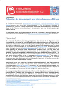 Der Fachverband Medienabhängigkeit e.V. hat deshalb sein Positionspapier aus dem Jahr 2009 zur Prävention von computerspiel- und internetbezogener Störung aktualisiert. Es werden folgende Punkte erläutert: