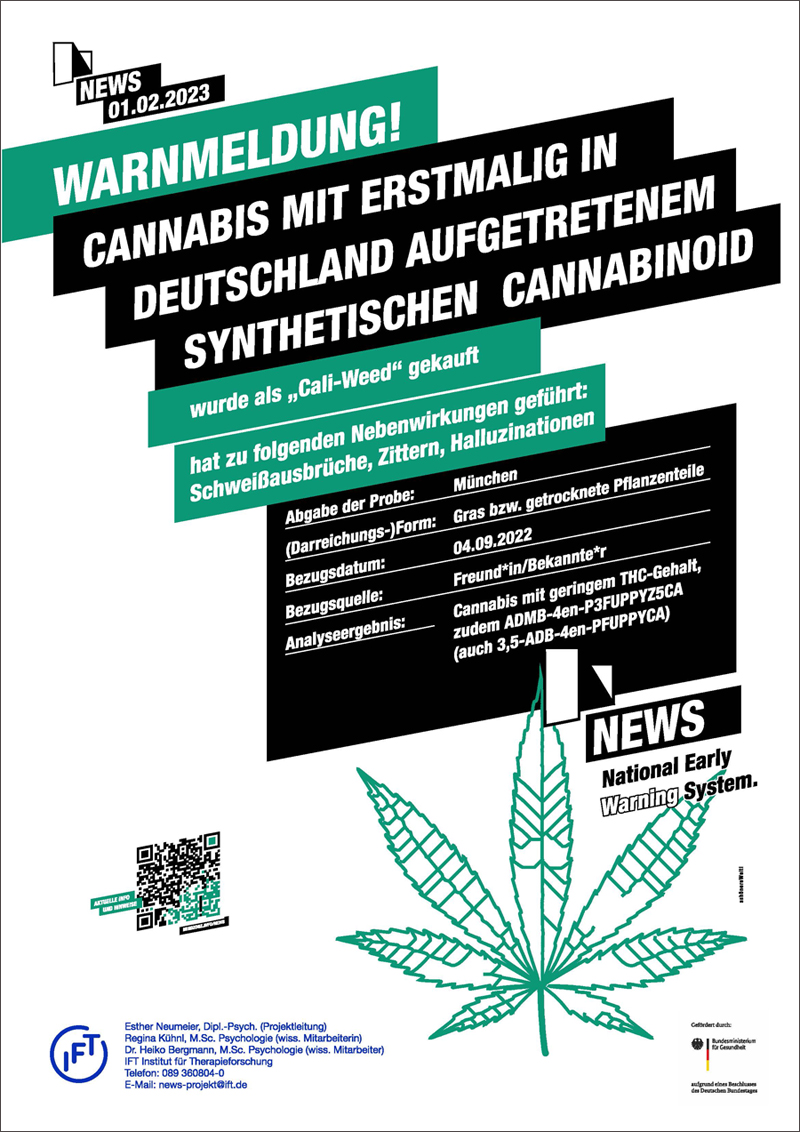 Bei dem synthetischen Cannabinoid handelt es sich um ADMB-4en-P3FUPPYZ5CA. Es wurde in Cannabis festgestellt, das Anfang September 2022 in München als „Cali Weed“ verkauft wurde. Als Nebenwirkungen des Konsums wurden Schweißausbrüche, Zittern sowie Halluzinationen beschrieben.