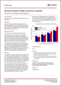 Die Längsschnittanalyse zum Einfluss von Werbung für E-Zigaretten auf das Rauchverhalten von Kindern und Jugendlichen schließt eine Forschungslücke und wurde in der Fachzeitschrift „Addictive Behaviors“ veröffentlicht: „Electronic cigarette advertising and teen smoking initiation“. https://www.sciencedirect.com/science/article/abs/pii/S0306460319305891