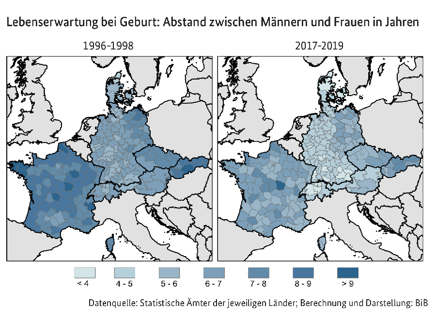 Über viele Jahrzehnte hinweg stieg die Lebenserwartung von Frauen schneller als die der Männer. Seit Ende des 20. Jahrhunderts verringern sich aber die Unterschiede wieder. Wo die Lücken zwischen Männern und Frauen besonders gering oder noch auffallend groß sind, damit haben sich Forschende am Bundesinstitut für Bevölkerungsforschung (BiB) in einer neuen Studie beschäftigt. Hierfür haben sie erstmals detaillierte Todesursachendaten für 228 Regionen in sieben europäischen Ländern untersucht.