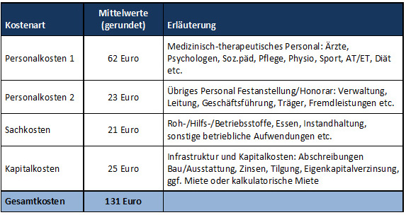 Ein Gutachten der aktiva – Beratung im Gesundheitswesen GmbH für das Jahr 2011 (aktiva 2012, Was kostet die Rehabilitationsleistung?) weist nach, dass in den Hauptindikationen der medizinischen Reha die Kosten die realen Vergütungen (zwischen 110 und 118 Euro in den genannten Indikationen) bei Weitem übersteigen und eine strukturelle Unterfinanzierung von zehn bis 20 Prozent existiert (siehe Abbildung 2).