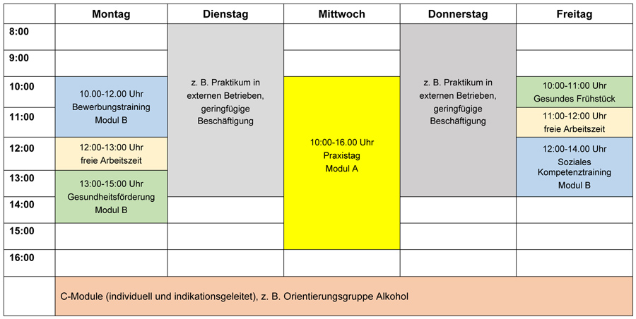 Die Teilnehmenden werden in drei Gruppen aufgeteilt und erhalten zu Beginn der Maßnahme einen Wochenplan (s. Abb. 2). Jede Gruppe erscheint an drei Tagen pro Woche für insgesamt mindestens 15 Stunden. Davon finden an zwei Tagen Lernmodule zum Training sozialer Kompetenzen, Gesundheitsförderung und Bewerbungscoaching statt. Zudem begeben sich die Teilnehmenden selbstständig auf Stellensuche und aktualisieren ihre Bewerbungsunterlagen. Einmal pro Woche bereiten sie gemeinsam ein gesundes Frühstück zu. Am Praxistag werden vier Gewerke (Holz, Metall, Lagerlogistik und Handel) angeboten. Die Teilnehmenden werden dazu angeregt, gemeinsam als Gruppe Projekte zu planen und umzusetzen. So stellen sie kleine Möbel und Gegenstände für den Gemeinschaftsbereich sowie nützliche Utensilien für den Eigengebrauch her. Weitere Arbeitserprobungen erfolgen bei begleiteten Praktika in externen Betrieben. Die Qualifizierungsmodule im EDV-Bereich festigen bestehendes Wissen und vertiefen es, ein Zertifikat wird nach erfolgreicher Teilnahme ausgestellt.