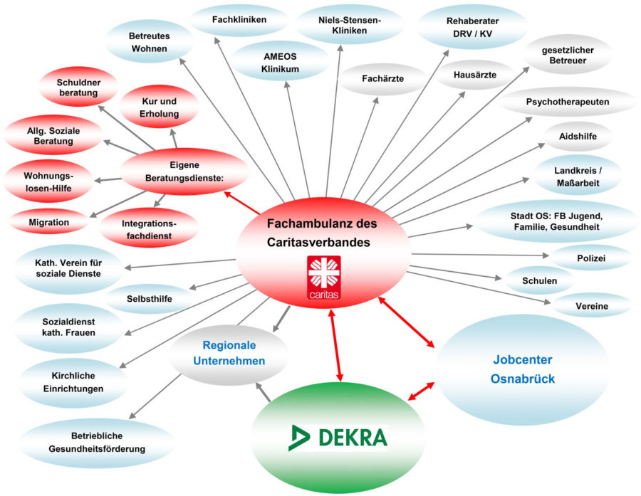 Aus diesen Gründen schrieb das Jobcenter über das Regionale Einkaufszentrum Nord eine Maßnahme aus, welche folgende Inhalte aufweisen sollte: Die Maßnahme sollte tagesstrukturierend sein, auf den ersten Arbeitsmarkt vorbereiten, zielgruppenspezifische Angebote umfassen und eine intensive Bearbeitung der Vermittlungshemmnisse ermöglichen. Mitarbeiter der Suchtberatung des Caritasverbandes in Osnabrück erarbeiteten daraufhin ein Konzept, das explizit diese Zielgruppe mit den entsprechenden Vermittlungshemmnissen erreichen sollte. Durch die suchtspezifische Fachlichkeit, die Nähe zur Fachambulanz für Suchtprävention und Rehabilitation, aber auch zu anderen Fachbereichen und Kooperationspartnern, sollte der Zugang erleichtert werden, und Schwellenängste der Teilnehmenden sollten verringert werden. Nicht allein die Preiskalkulation, sondern die Qualität der Maßnahme stand dabei im Vordergrund. Der Caritasverband Osnabrück bekam den Zuschlag zunächst für ein Jahr. Inzwischen läuft die Maßnahme im fünften Jahr nach der dritten Ausschreibung, diesmal voraussichtlich bis 2019.