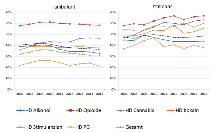 Die Zahlen aus dem Jahr 2015 zeigen, dass der Anteil an arbeitslosen Klienten, die bereits sechs Monate vor Betreuungsbeginn erwerbslos waren, bei Fällen mit HD Opioide sowohl in ambulanten als auch in stationären Einrichtungen am höchsten (ambulant: 58 Prozent; stationär: 67 Prozent) und bei Fällen mit HD Stimulanzien am zweithöchsten (ambulant: 46 Prozent; stationär: 63 Prozent) war. Insgesamt ist der Anteil der Erwerbslosen im Verlauf der Jahre 2007 bis 2015 über alle HD in ambulanten Einrichtungen um etwa vier Prozentpunkte auf 36 Prozent gesunken und in stationären Einrichtungen um etwa einen Prozentpunkt auf 48 Prozent gestiegen. Der Anteil arbeitsloser Patienten war in stationären Einrichtungen insgesamt höher als in ambulanten Einrichtungen. Der größte Unterschied zwischen ambulantem und stationärem Setting in Bezug auf die Hauptdiagnosen fand sich bei Fällen mit HD Cannabis. Bei diesen Fällen lag im Jahr 2015 der Anteil Erwerbsloser bei 31 Prozent im ambulanten und bei 60 Prozent im stationären Setting.
