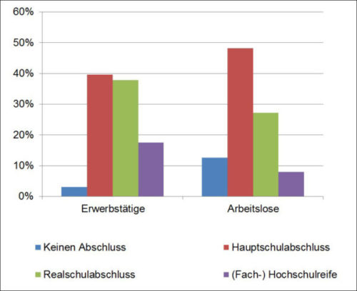 Hinweise für die letzten beiden Punkte finden sich beispielsweise in der ARA-Studie (Henkel, Dornbusch & Zemlin, 2005; Zemlin, Henkel & Dornbusch, 2006), in der arbeitslose Alkoholabhängige nach Behandlung schlechtere Werte in den Bereichen Lebenszufriedenheit, Problembewältigungsstrategien, physische und psychische Gesundheit sowie in der sozialen Integration und Partizipation aufweisen und höhere Rückfallraten haben als Erwerbstätige. Unter den Arbeitslosen war der Anteil derjenigen ohne Berufsausbildung höher als bei Erwerbstätigen. Dies bestätigte sich auch in einer Untersuchung der Klientel in der deutschen Suchthilfe (Kipke et al., 2015). Arbeitslose Klienten, die aufgrund einer Hauptdiagnose im Bereich illegaler Substanzen in Beratung oder Betreuung waren, verfügten beinahe doppelt so häufig über keine abgeschlossene Hochschul- oder Berufsausbildung wie erwerbstätige Klienten.