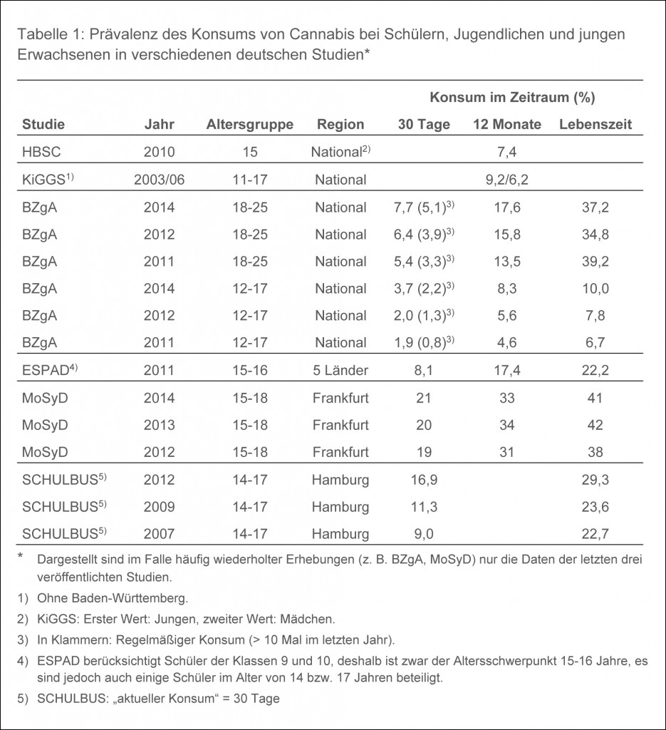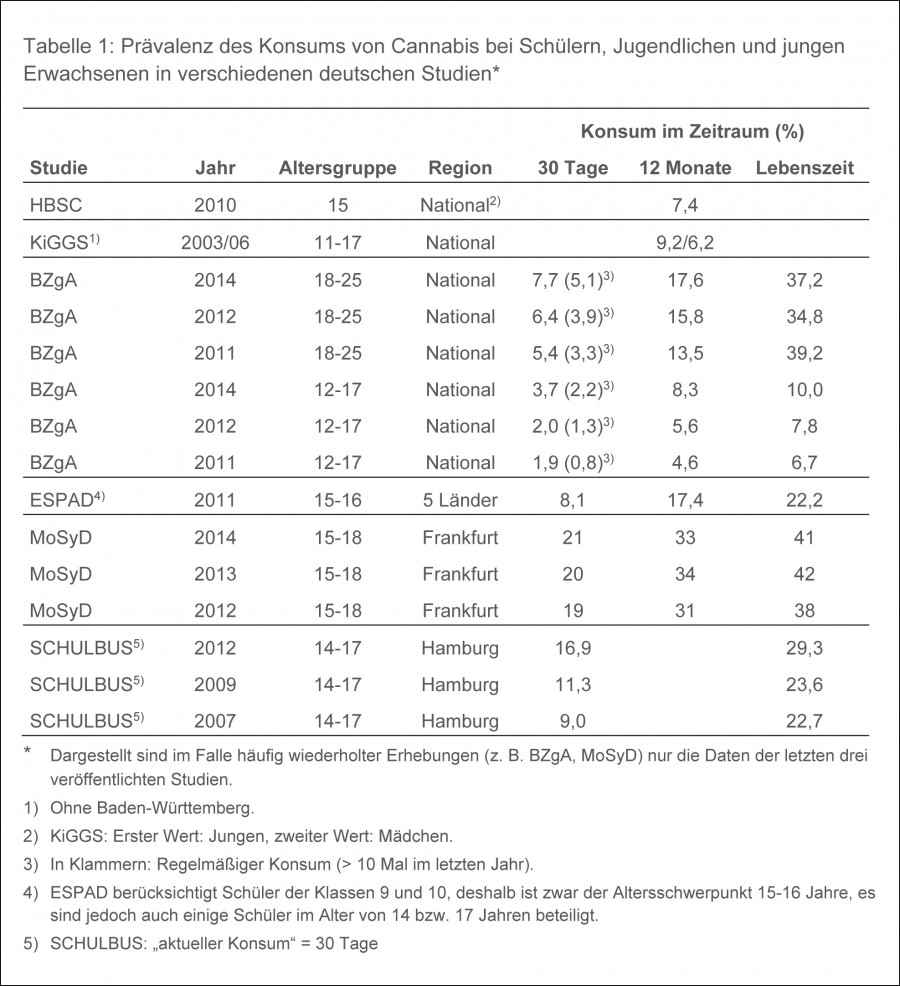 Tabelle 1 bietet einen Überblick über die in verschiedenen Studien unter Jugendlichen und jungen Erwachsenen in Deutschland erhoben Daten zum Cannabiskonsum.